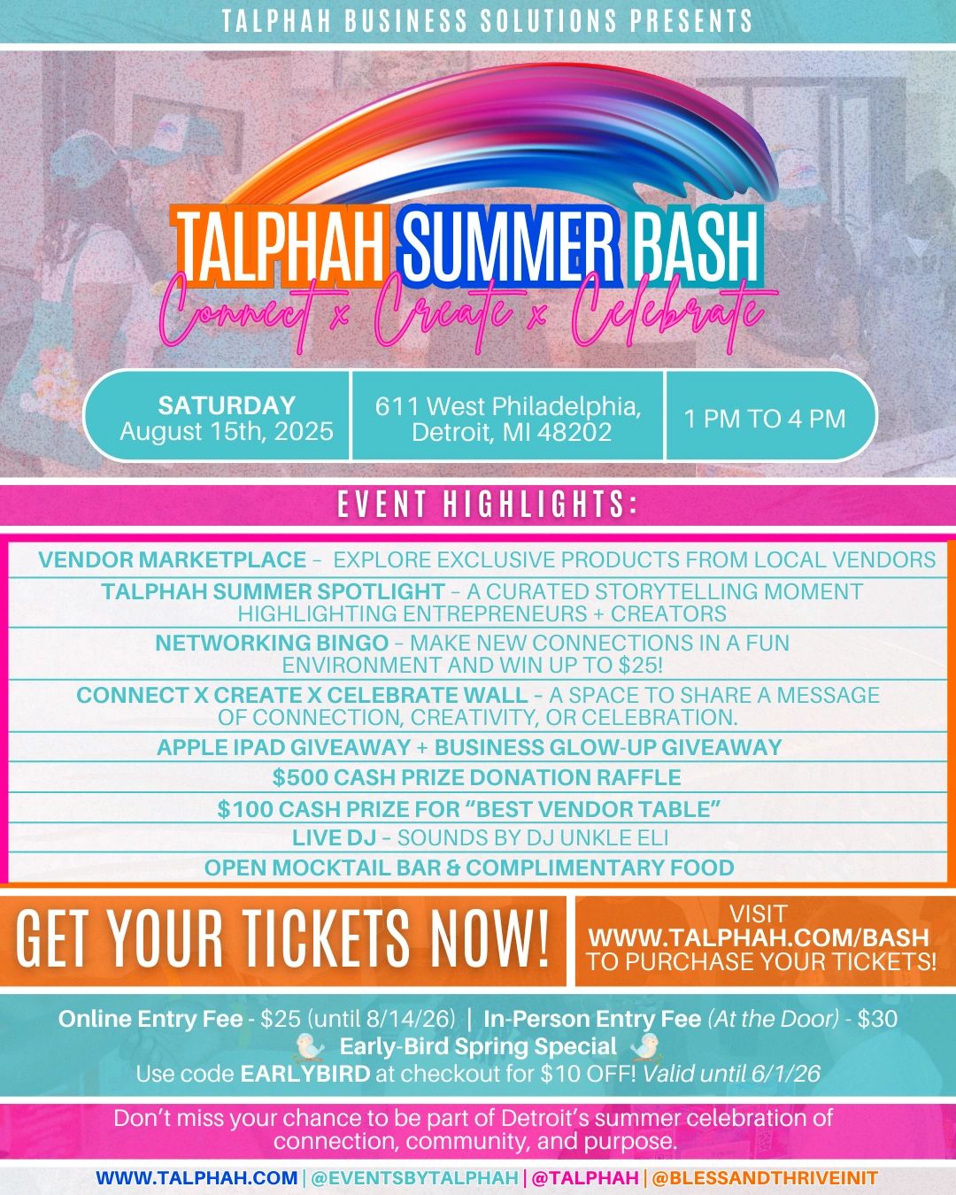 The Talphah Summer Bash returns to Detroit, Michigan on Saturday, August 15th, 2026 from 1 PM to 4 PM. Spend the afternoon enjoying great food, good vibes, and an exciting mix of networking, creativity, and community.